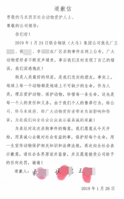 另一方面,该公司也向媒体公开3人的道歉信,内容为3人知道狗是人类最好的邻居及忠实的朋友,人类应爱护动物,因此对于他们个人鲁莽行为,给公司、大马政府及广大动物爱好者,带来负面影响及伤害,向社会公众道歉。