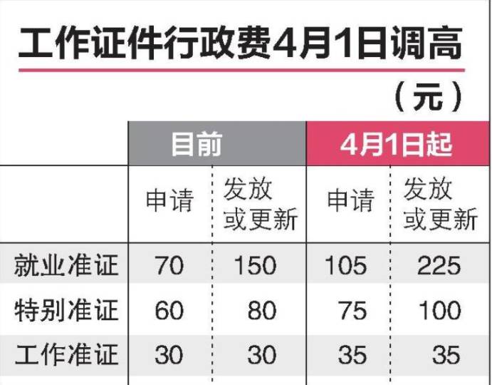 雇主4月起申请或更新外籍员工的工作证件时,须缴交更高的行政费,费用增幅最高达50%。