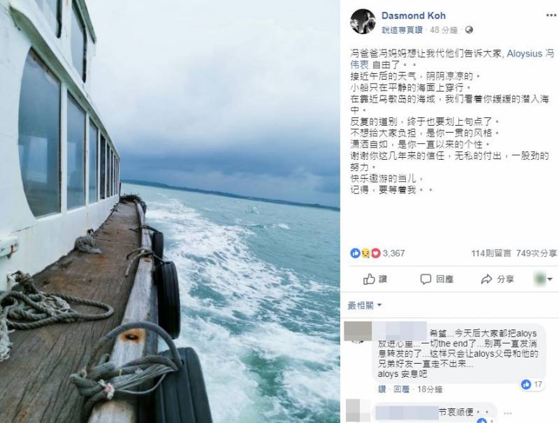 午言媒体负责人许振荣日今午在面子书上载一张在海上的照片,并贴文:“冯爸爸冯妈妈想让我代他们告诉大家,冯伟衷自由了。”