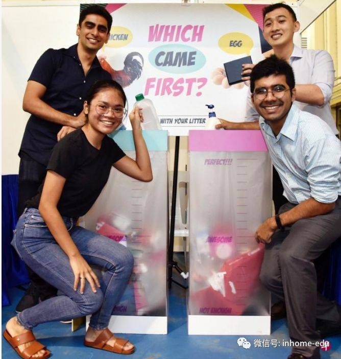 新加坡国立大学学生努瑞恩(前排左下角起顺时针)、库什、陈伟耀和阿卡展开试验计划,将垃圾桶设计为“投票箱”,以趣味方式宣导人们别乱抛垃圾。(特约摄影伍书永)