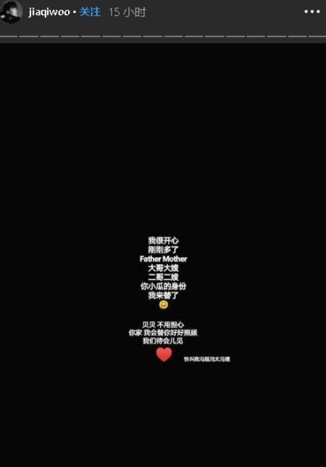 胡佳琪在其中一则限时动态中说,“快叫我冯姐冯太冯嫂”,自己现在会担任“小瓜”(家人对冯伟衷昵称)的角色,替男友好好照顾他的家人,让对方不要担心。