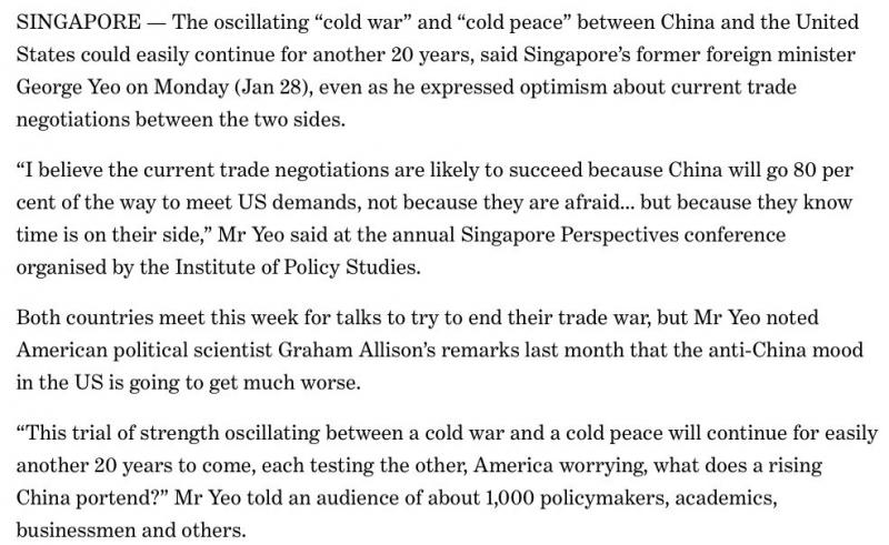 前新加坡外交部长杨荣文杨荣文2019年1月28日在“新加坡透视”(Singapore Perspectives)论坛上就新加坡和世界的关系发表讲话。他吁请新加坡人继续保持同外国的联系,他表示,新加坡的文化和国际关系多元性是新加坡能持续发挥影响力的原因,新加坡一旦放弃这个优势,就会成为“无关紧要”的国家。