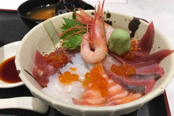 新鲜的刺身饭绝对是日料爱好者的心头好。撒上点芥末和酱油,甜虾、三文鱼的甜味在咀嚼过程中满满释放出来,加上鱼籽带来的”爆浆感“,吃得人一脸幸福。