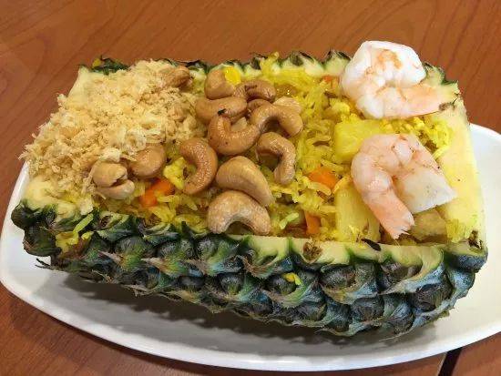 冬阴功汤里有满满的海鲜,菠萝饭也是铺满一层的腰果、肉松和虾仁。值得一提的是,这里也有中式口味的菜品,且菜单上有中文,很适合带国内的长辈一起来品尝。
