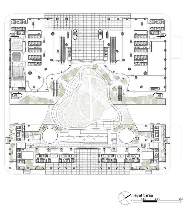 今天,超过50%的世界人口生活在城市。在未来30年,这个数字将增加到70%。到2050年,世界人口将增加到90亿或100亿。在城市群中,没有高层建筑就无法适应这种增长。绿色之心是Marina One的核心概念。它是由ingenhoven建筑师事务所与景观设计师Gustafson Porter + Bowman密切合作设计的。建筑的几何形状和花园之间的相互作用促进了自然通风,产生了宜人的小气候。新加坡滨海湾中央商务区最大的公共景观区提供了接近自然的生活空间,其使用面积是原始场地面积的125%。