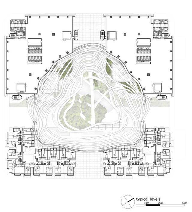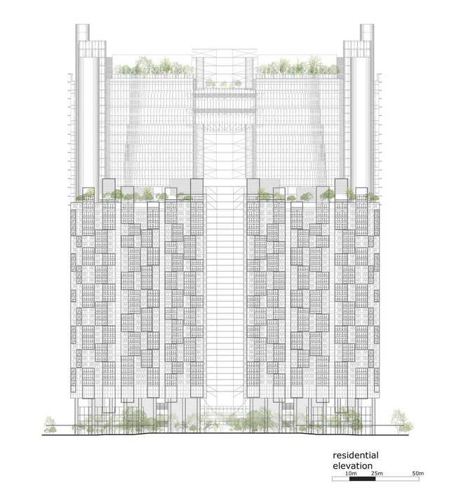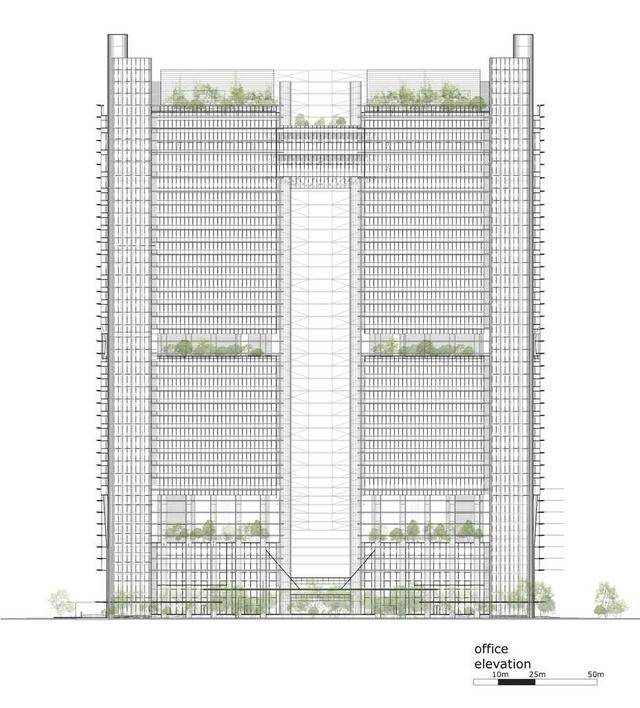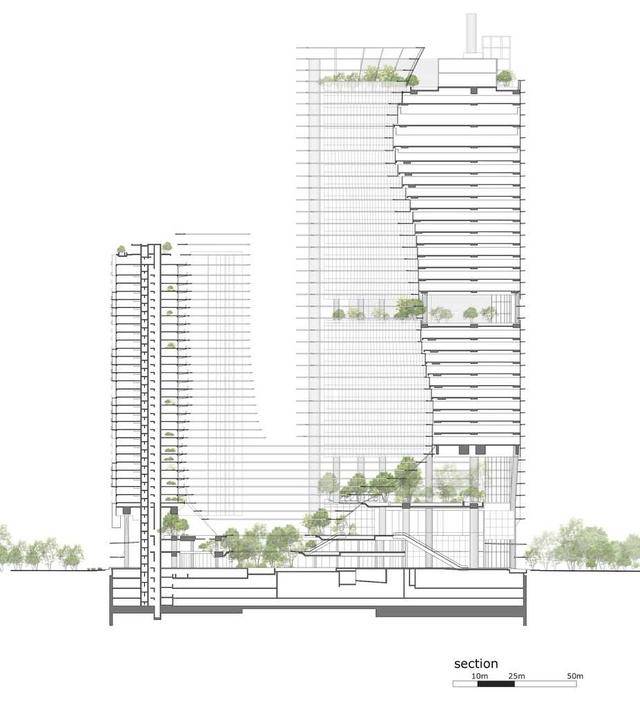 这个高密度建筑综合体的综合用途超过40万平方米,它由四个高层建筑组成,定义了绿色心脏——一个延伸到几层楼的公共空间。这个立体的绿洲反映了热带植物的多样性。