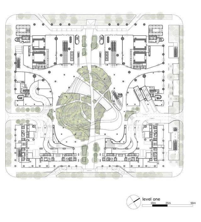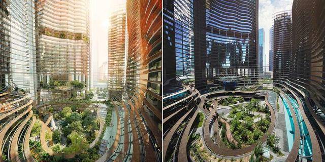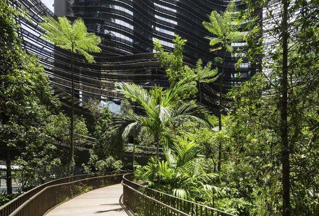 建筑综合体的有机形状及其标志性的百叶窗和密集的种植,有助于改善小气候和增加生物多样性。受亚洲水田梯田的启发,由四个塔楼组成的绿色中心——带有多层立体花园——反映了热带植物的多样性,并创造了一个新的栖息地。这颗绿色的心脏由350多种不同种类的树木和植物组成,其中包括700棵树,占地37000平方米。各种各样的动物成为这种生物多样性的一部分。受雨林不同垂直水平上的自然气候变化的启发,景观建筑模仿了一个绿色山谷,其气候随层次变化。餐厅和咖啡馆,零售区域,健身俱乐部,游泳池,超市,美食广场,以及不同露天平台上的活动区域,不仅为居民,办公室工作人员和游客提供产品和服务,还为社交活动创造了场所。