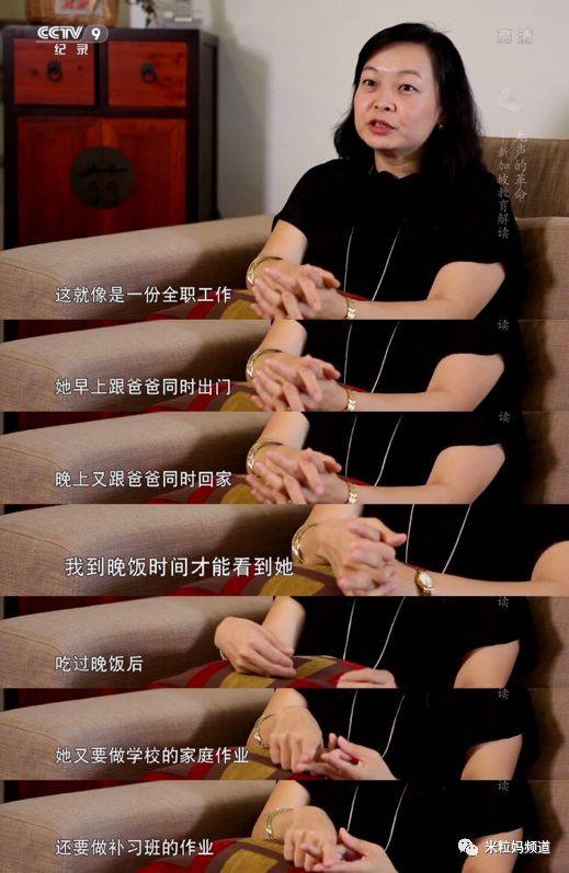 “这就好像是一份全职工作,她早上跟爸爸同时出门,晚上又跟爸爸同时回家,我到晚饭时间才能看到她,吃过晚饭后,她又要做学校的家庭作业,还要做补习班的作业。”