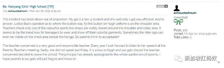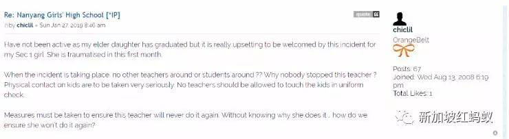 红蚂蚁同样也接获南中学生家长的投诉说,她的孩子看到有老师在课室里,一下叫学生举起双手,要学生拉下肩带,说要检查内衣的颜色。在社交媒体平台“kiasuparents.com”,也有一群家长和校友在谈论这个话题。