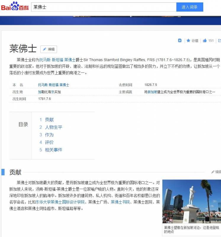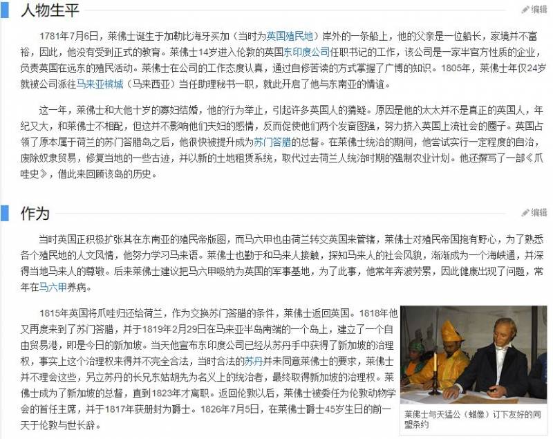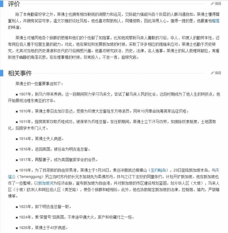 小结:百度百科用词之华丽高尚,让人差点忘记莱佛士只是千千万万个殖民者中的一员,只是他的眼光和才干优于他人;维基百科则公正的评价了他的功与过。我们应该以一种客观的眼光来看待,或者说放在历史的长河里,更能体会事件的意义,无需过度神话,更无需莫名耻辱,因为以一种经营公司的态度去统治殖民地,源自英国古老的历史传统。