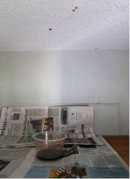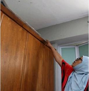 Jamilah抬头一看,发现白色天花板出现几个黑点,深红色的发臭液体,是通过天花板滴下来的。