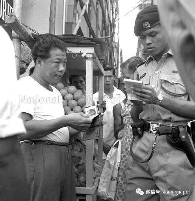 1963年,一位在莱佛士坊的无牌小贩被罚款。照片来源:国家档案馆