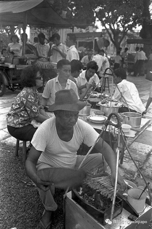 1966年,在政府大厦草场附近(靠近现在的滨海艺术中心和鱼尾狮)的沙爹小贩,照片来源:国家档案馆