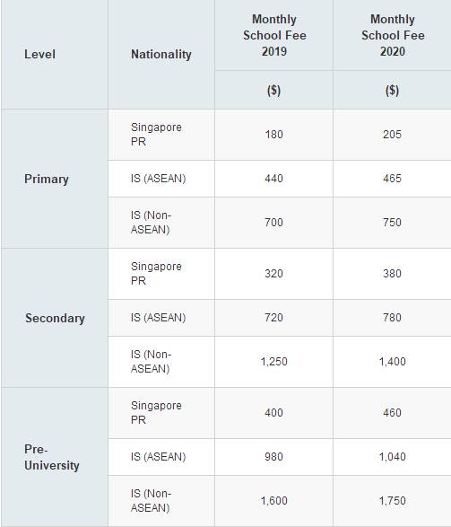 下表为2017年至2020年新加坡永久居民和国际学生应付的学费和杂费: