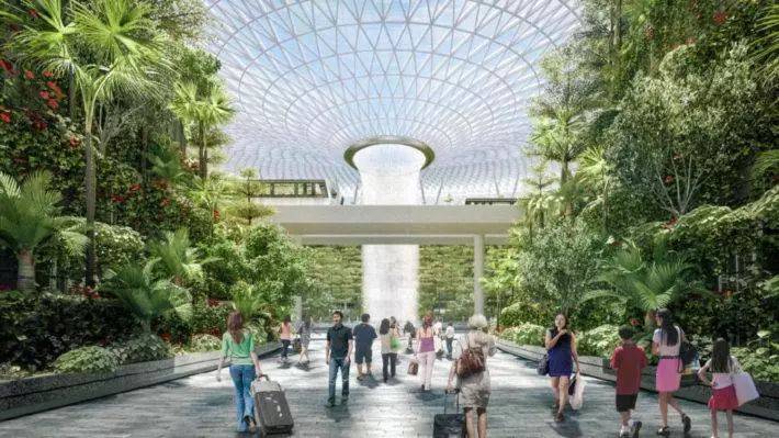 地点虽然远了一点,在新加坡樟宜机场一号航站楼前方。和T1的入境大厅直接相连,同时,还有行人天桥可以直接通到T2,和T3,有冷气的呦。打破了机场的次元壁,这里是集航空设施,花园景观,住宿餐饮和购物娱乐为一体的场所。