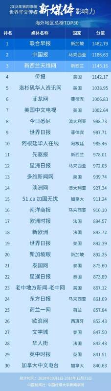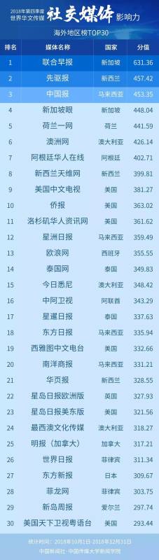 昨天(1月30日),中国新闻社与中国传媒大学新闻学院联合发布了《2018年第四季度世界华文传媒新媒体影响力榜单(海外)》,新加坡的中文媒体表现亮眼。