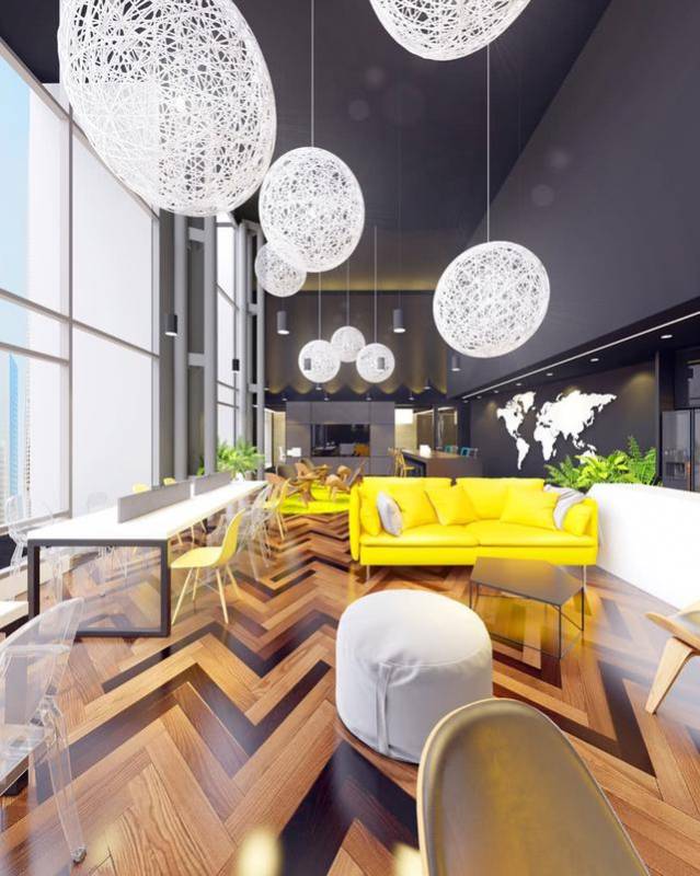 迈出电梯的一刻就能感受到社区独特的设计魅力,新加坡武吉士·优客工场突破传统,空间利用黑色的天花板喷黑与深灰色地毯,营造出的高低错落感,使得空间更加通透。进入大门,经过无遮挡式的空间设计,入驻企业可将景色及光线尽收眼底,在踏进门的瞬间就开启一天工作的好心情。整个前厅充分利用了极高的挑空搭配以白色藤球灯,使得空间感更强,深灰色天花板更加突出了视线内的明亮感,以达到放松舒适的空间感受。