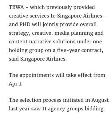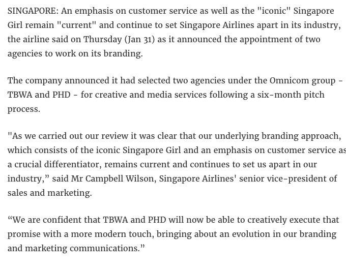 47年后,新航在经过6个月公开竞标,从11个家公司当中,挑选出宏盟集团(Omnicom Group)旗下的 TBWA 和 PHD 主导公司往后的品牌和宣传营销。