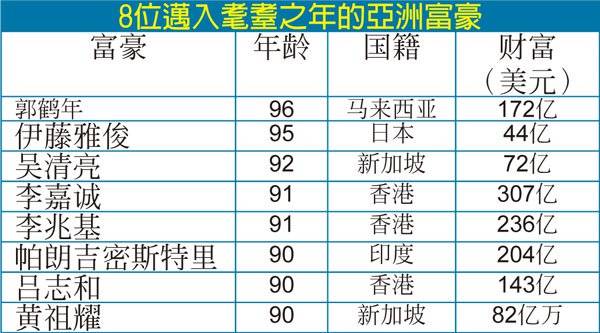 根据“彭博亿万富豪榜”,过去白手兴家的亚洲富豪如今都已垂垂老矣,全球首500大富豪中有21人已是90岁以上高龄。其中,年届96岁的郭鹤年不仅是大马首富,也是全球最年长富豪。