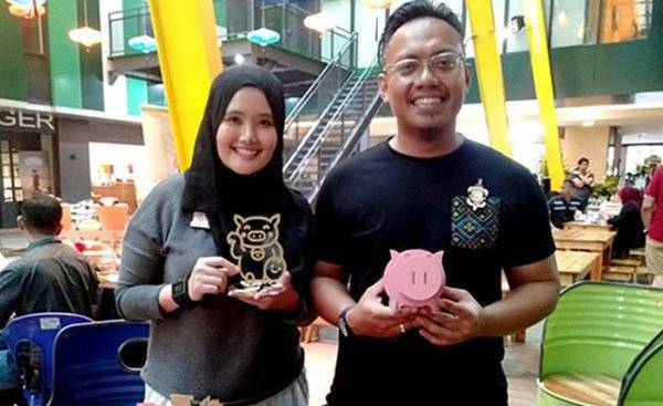 尤丽娜(左)与丈夫在商场上售卖小猪饰品。(图取自Lobak Merah网站)