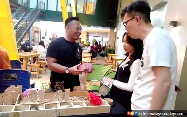 尤丽娜的丈夫向华裔客户兜售猪饰品。(图取自Lobak Merah网站)