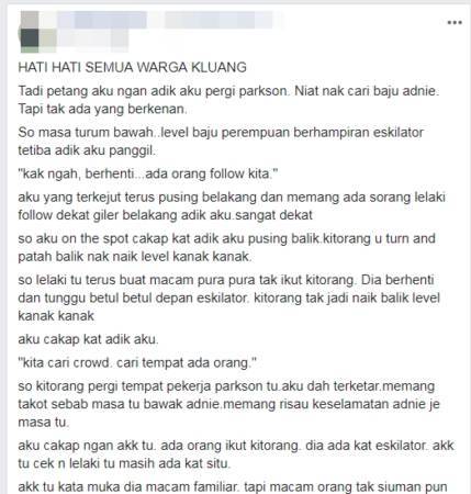 贴文指,她想起以前在居銮有发生过母女被跟踪事件,当时感到非常害怕,甚至全身发抖,因为孩子在身边,很担心孩子会被掳走。
