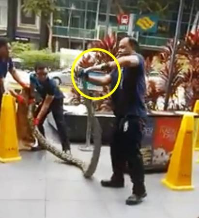乌节路万豪唐广场酒店(Singapore Marriott Tang Plaza Hotel)门口外的花槽下,星期二(29日)突然出现一条三米长的蟒蛇。捕捉人员抓蛇过程被公众录下,在网上疯传。
