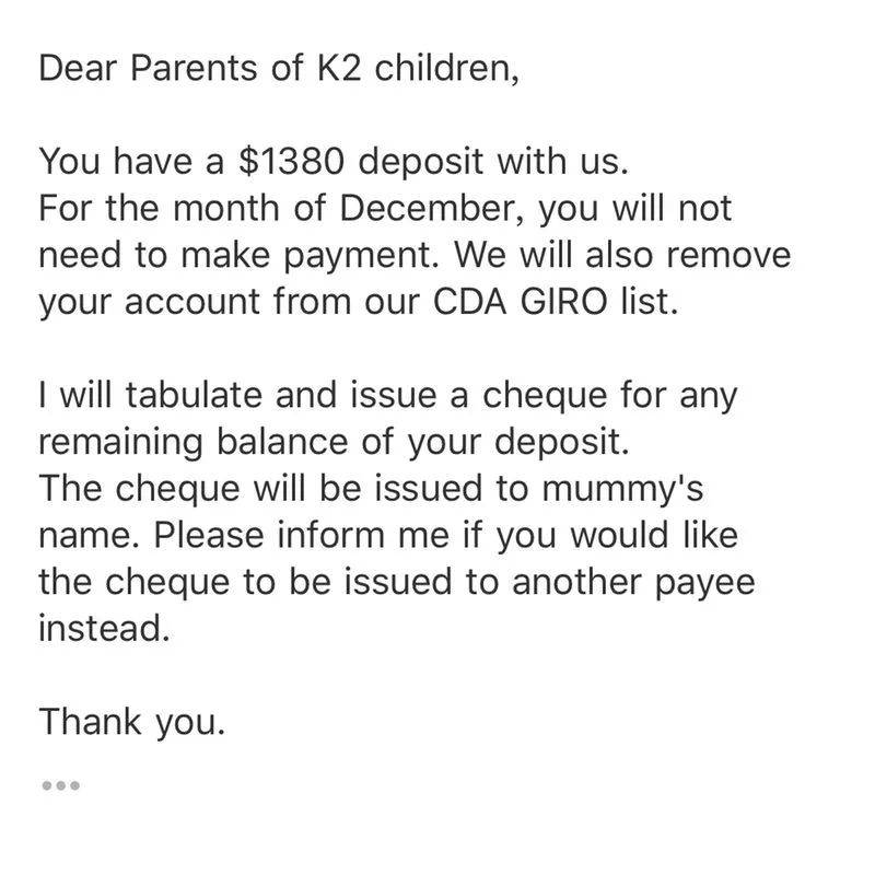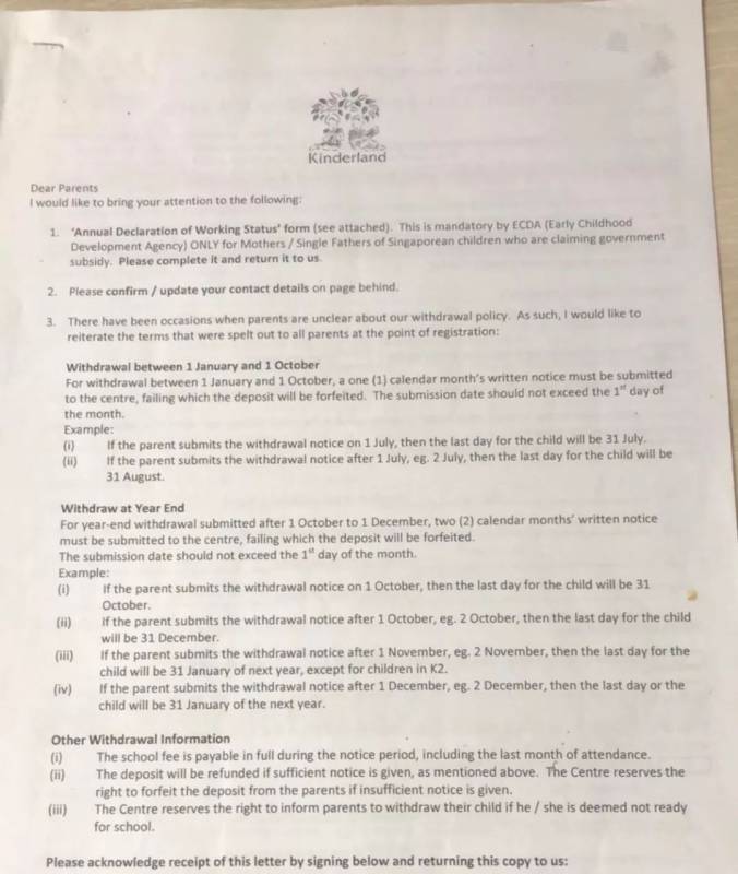我们其实都有建议让每个幼儿园都发出这封通知信给到所有家长,只是这间学校没有做,但无奈我们只是监管部门,并没有权利强制要求校方必须退还押金,但我们会尽力帮忙联络Kinderland总部,希望那边可以圆满的帮你们解决问题!
