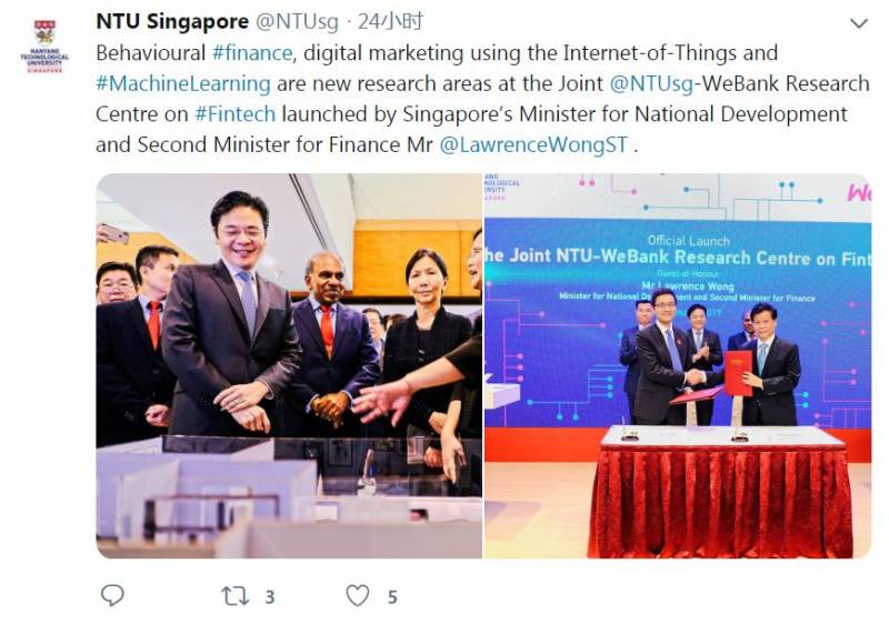 新加坡南洋理工大学(NTU)与中国首家数码银行——微众银行(WeBank)联合设立一个金融科技(FinTech)研究中心,旨在帮助银行客户随时随地获得个人化银行服务。