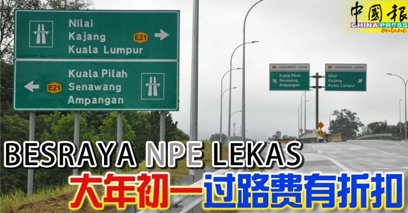 (吉隆坡1日讯)大道管理公司IJM收费站管理层宣布,该公司旗下新街场大道(BESRAYA)、新班底谷大道(NPE)和加影芙蓉大道(LEKAS),将在2月5日农历新年大年初一当天,提供一级车辆驾驶者10至30%过路费折扣优惠。
