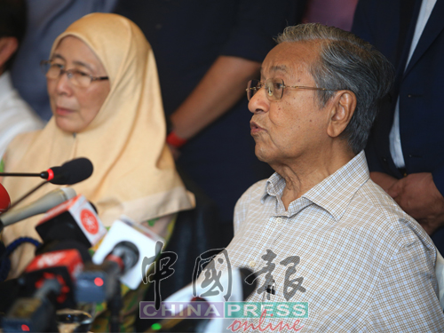马哈迪(右)在记者会上回应记者的提问,左起为陈国伟和旺阿兹莎。