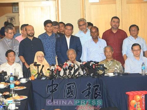 马哈迪(前排中)主持希盟最高中央理事会会议后召开记者会,左起为行动党主席陈国伟、副首相旺阿兹莎、内政部长慕尤丁及财政部长林冠英。