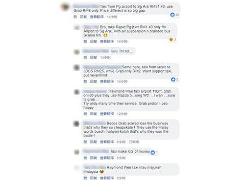 有网民留言称,他从槟城国际机场乘坐德士前往新港(Sungai Ara)需花费31令吉40仙,反之,乘坐私召车GRAB仅需花费8令吉。