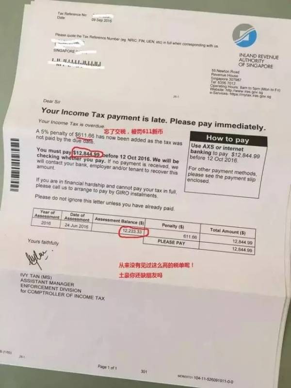 不过新加坡和大多数国家一样,也是收入越高交税越高。让我们来观摩下网上一位土豪朋友的报税单。下图内的纳税人因为未及时缴税还被罚款了,所以说纳税要及时呀,毕竟罚款也是按税率征收,像这么高的薪资罚款一次几百块大洋就去了,真的是心疼啊。