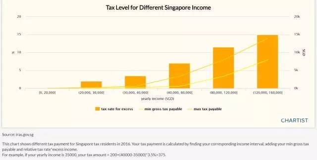 例如: 年总收入35,000, 前30,000的税额为200,余额5,000的税额是5,000X3.5%=175, 所以总税额为375。大家可知道,就在3年前,也就是新加坡50周年,新加坡政府宣布全部个人所得税都直接打5折,这也太实惠了吧本来已经很低了,没想到还能打折,也不知道下次有这么好的福利是什么时候呢。。
