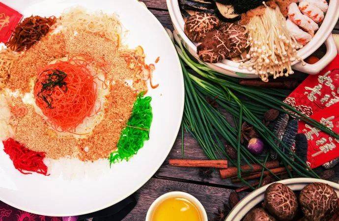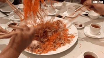 吃的时候大家拿起筷子把所有食材搅拌并高高捞起,甚至有人会站在凳子上捞鱼生,嘴里也要喊著“捞起捞啊,发啊!”,寓意越捞越旺,风生水起。