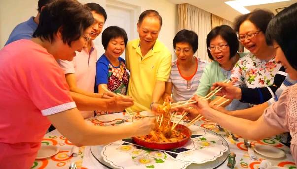 吃的时候大家拿起筷子把所有食材搅拌并高高捞起,甚至有人会站在凳子上捞鱼生,嘴里也要喊著“捞起捞啊,发啊!”,寓意越捞越旺,风生水起。