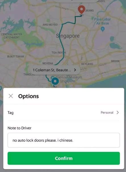 还有网友在招车时备注“请不要让门自动上锁好吗,我是华人。” 这个订单的目的地是新加坡精神病院........