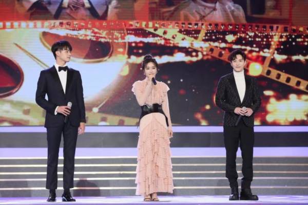 许凯(左起)、秦岚和王冠逸在《文联春晚》合唱《延禧攻略》主题曲。(照片由沃星经纪提供)