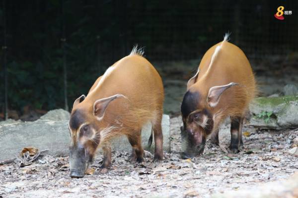 非洲野猪(Red River Hog,又称红河猪)的外形十分特别,与大家印象中的猪长得不一样。动物园教育助理总监曾宝如介绍猪只品种时说:“它整身是橙色的毛,背部有一条很清晰的毛发,耳朵是长长,尾部也有毛,很可爱。”