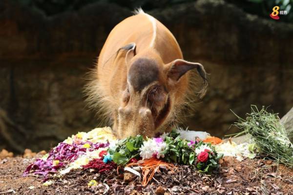 在星期四(24日)的媒体预览活动上,动物园就特别为非洲野猪准备了以包菜、胡萝卜、意大利面、甜菜根和柳橙为佐料鱼生,十分有新年气氛。