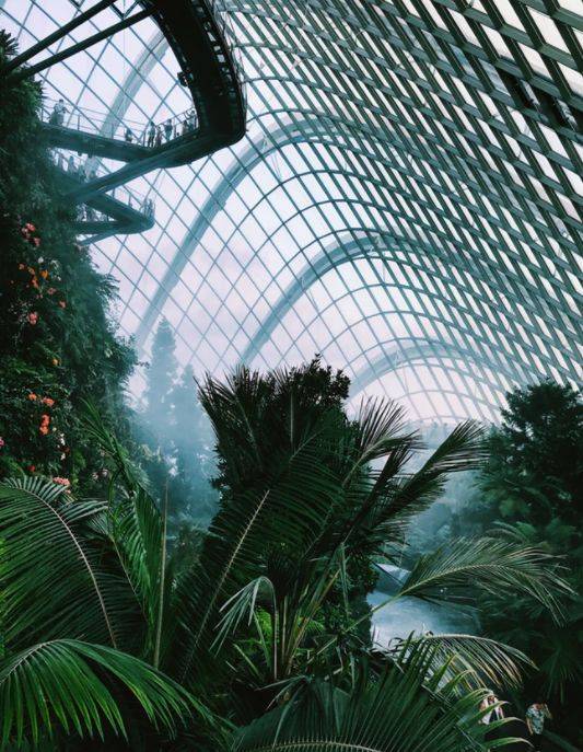 滨海湾花园室外园区都是免费开放的,最有名气的花穹(Flower Dome)和云雾林(Cloud Forest),这两处玻璃建筑生态区是收费的,是南花园的精华所在。花穹和云雾林坐落在一起,外观看起来是两个巨大的半球形。