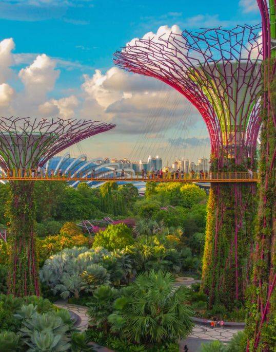 人类迄今最大的景观工程之一:新加坡滨海湾花园(Gardens by the Bay)由滨海南花园、滨海东花园和滨海中花园三个风格各异的水岸花园组成。其中最大的滨海花园属滨海南花园,园中建有多棵巨大的超级树 (Supertree),十分引人注目。 这些超级树其实是一座座 16 层楼高的垂直花园,您在树顶可以鸟瞰整个花园景色。 此外,超级树还具备多项实用性功能:收集雨水、生成太阳能以及充当公园温室的通风管道。