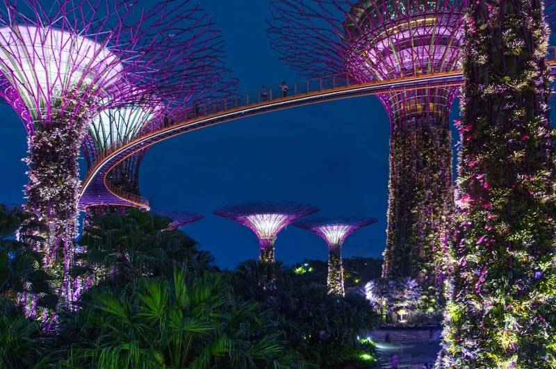 擎天树丛是滨海湾花园重要的能量来源,树的高度在25-50米之间,外层缠绕有200多种、超过16万株的蕨类植物、攀爬植物和热带花卉,形成独具一格的垂直花园,令人惊叹不已。