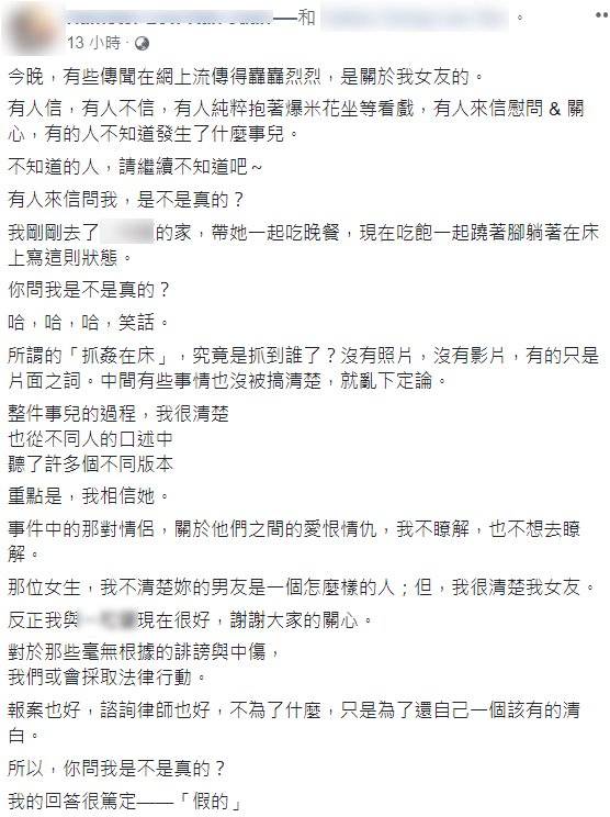 他也在文中质疑女网友所发的“捉奸在床”没有真凭实据,只有片面之词,甚至揶揄对方没有搞清楚事情就乱下定论和贴文指控。