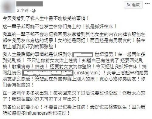 她指出,其男友出轨的对象是名网红,且后者已有交往对象,并在贴文中提到后者与情人十分恩爱,却没料到会外遇。