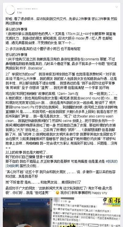 他在文中指出,事发当天,他与该女网红及网红朋友于凌晨在一间酒吧喝酒后直落唱K,但事后因喝醉了,便由女网红和其司机送他回家;回到家里后,他便醉倒在客厅,直至女友上门。