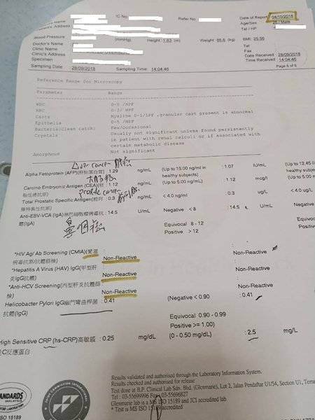 1)关于性病/艾滋之类抱歉我是没有的身体检查报告在comments 那里..不过鼻咽癌指数超表倒是真的, 几时来个癌症不懂, 最多不就来多一个标题“世纪渣男报应到终于..Blablabla”…