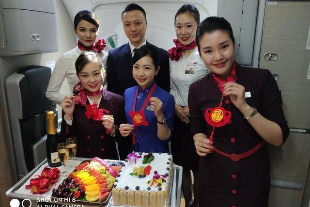 餐饮结束后,客舱经理邀请两位白金卡旅客共同切开了纪念蛋糕,并一起举杯,庆贺首航成功。航程中还为所有旅客准备了新年吉祥挂件,“福字”和“鸿运小猪”,送给旅客的同时,给大家也拜个早年,预祝所有旅客万事如意,身体健康!