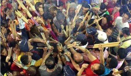 到了午夜12时前的10分钟,香客兴奋地一涌而上,围在金炉旁,还有人带领众信徒一起高喊“大 家‘发’啊!”等口号, 叫声此起彼落,全场气氛顿时沸腾起来。